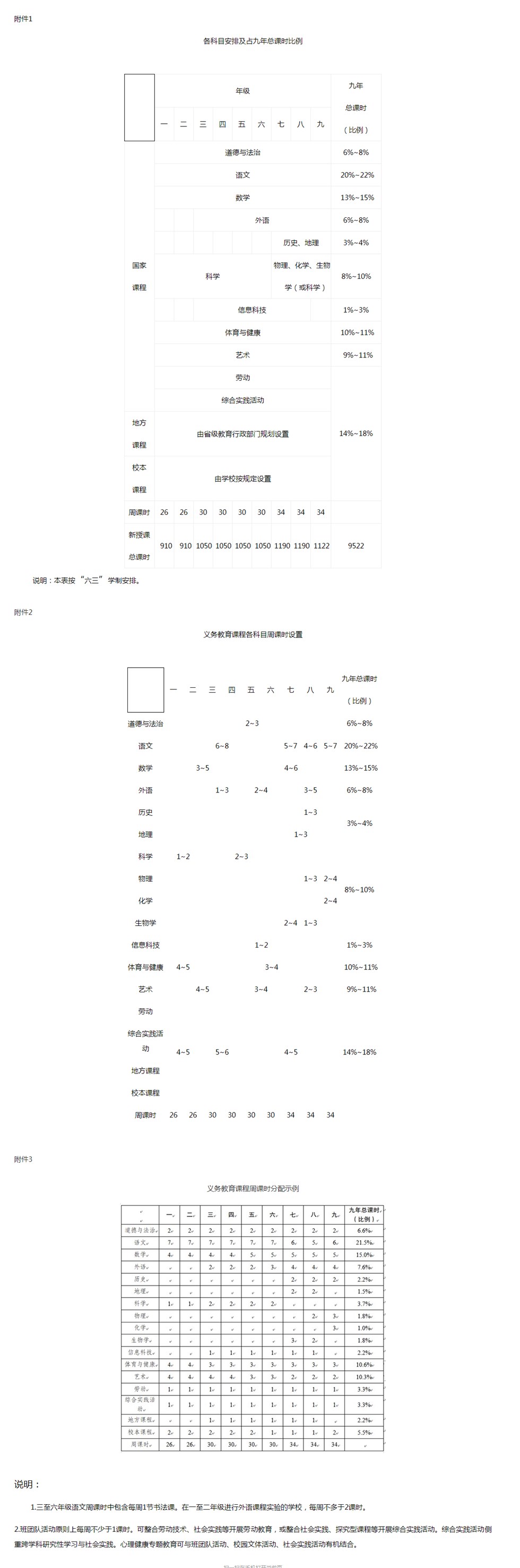 一至二年級每周26課時,三至六年級每周30課時,七至九年級每周34課時,九年新授課總課時數(shù)為9522。小學(xué)每課時按40分鐘計算,初中每課時按45分鐘計算。