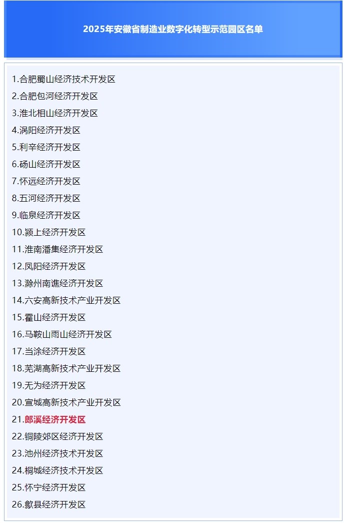 日前,安徽省工業(yè)和信息化廳公布2025省制造業(yè)數(shù)字化轉(zhuǎn)型示范園區(qū)名單,郎溪經(jīng)濟(jì)開(kāi)發(fā)區(qū)上榜。