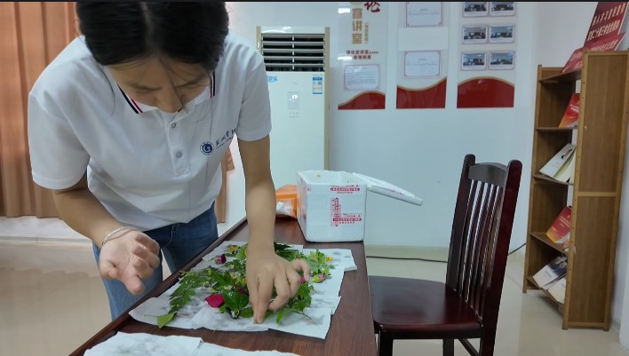 下午三點,北港社區活動室變身充滿生機的“自然工坊”。長桌上鋪滿形態各異的蕨菜、薄荷葉、玫瑰花等植物,孩子們手持小錘子,在大學生志愿者的指導下在白色筆袋上勾勒春日圖景,此起彼伏的敲擊聲與孩子們的歡笑聲交織在一起,整個活動現場洋溢著歡樂的創作氛圍。