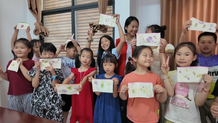 經過一個多小時的創作,每個孩子都完成了自己獨一無二的植物拓印筆袋。志愿者們一邊欣賞孩子們的作品,一邊為大家講解各種植物的特性,讓孩子們在藝術創作中收獲自然科學知識。