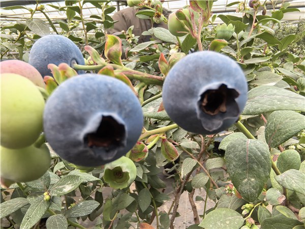 為解決冬季藍莓生長的溫度難題,基地在大棚設施上進行了重點升級?!拔覀兓乜偯娣e70畝,分兩期建設。新大棚采用三層防護——外層薄膜、中層遮陽網、內層保溫棉,保溫性能得到顯著提升。園區還增設了多臺熱風爐,低溫時可精準調控溫度?!泵穫ケ硎?,“正是由于設施條件的改善,今年藍莓的成熟期比去年提前了一個月。去年此時果實還小且未成熟,今年已經大批轉色了?!?