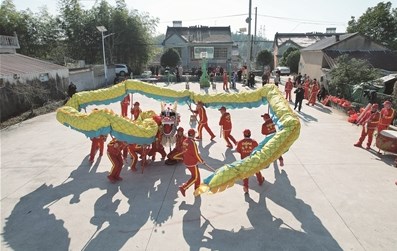 蔣家?guī)X舞龍已有100多年歷史。龍燈由竹篾編制,舞龍表演內(nèi)容豐富,主要分為游龍戲珠、龍騰四海、蜻蜓點水、金龍盤珠、老龍翻山五個部分。記者 謝旭 攝