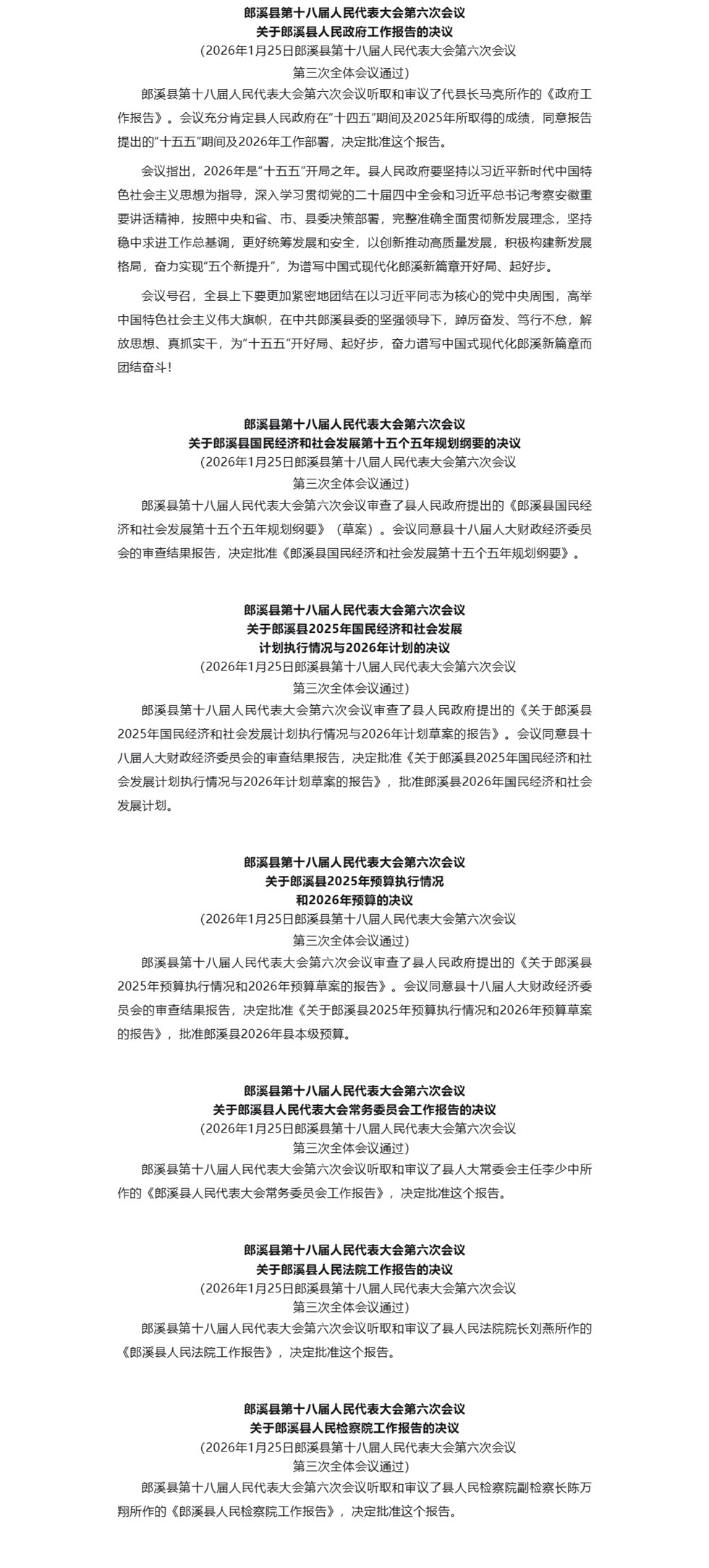 郎溪縣第十八屆人民代表大會第六次會議決議