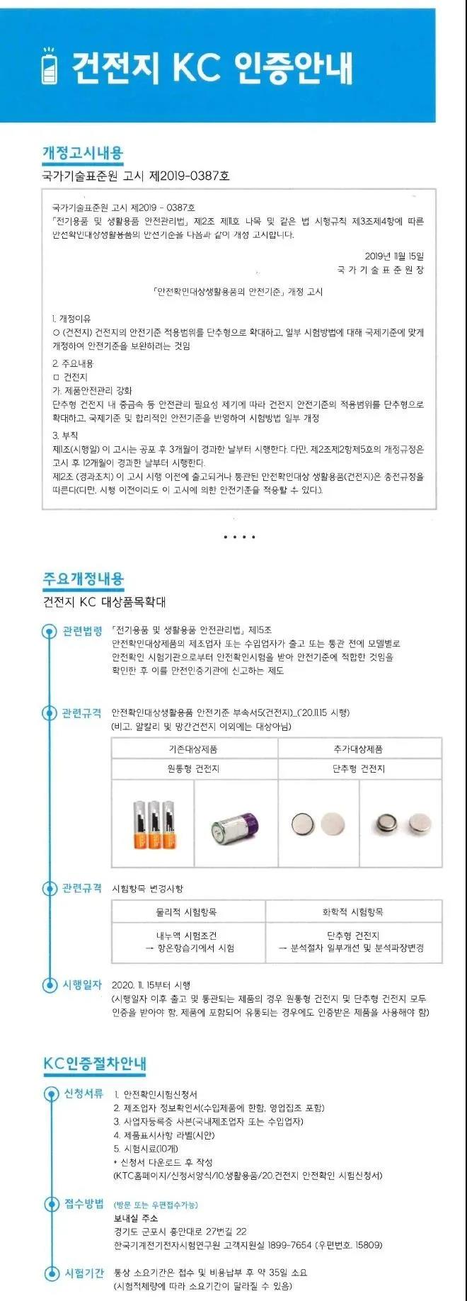 Recently, South Korea revised the \"Electrical Appliances and Household Products Safety Management Law\" to include button dry batteries for the first time in the scope of KC certification control. This regulation will take effect on November 15, 2020, and its control scope includes cylindrical batteries and button batteries. At the same time, if the terminal product contains cylindrical batteries and button batteries, the batteries used must also be certified by KC before they can be sold in the Korean market.