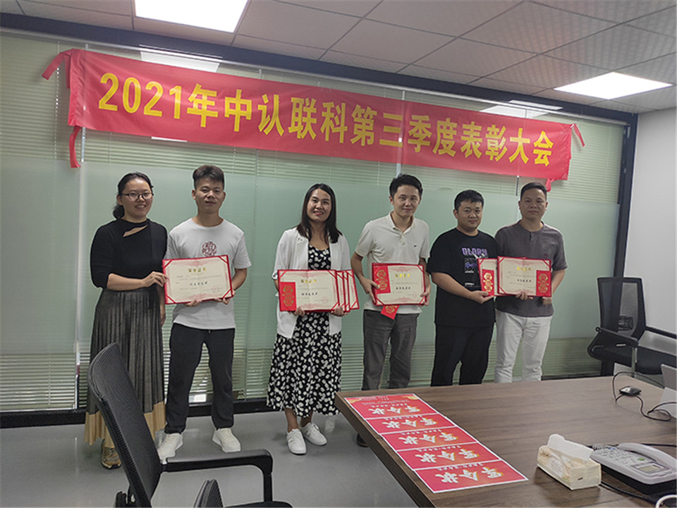 為增強(qiáng)公司員工的內(nèi)部凝聚力,提升公司的企業(yè)形象及競(jìng)爭(zhēng)力,中認(rèn)聯(lián)科檢測(cè)技術(shù)有限公司于10月16日下午4點(diǎn),在東莞會(huì)議室舉行了2021年中認(rèn)聯(lián)科第三季度表彰大會(huì)。銷(xiāo)售部全體員工和領(lǐng)導(dǎo)參與了本次會(huì)議。