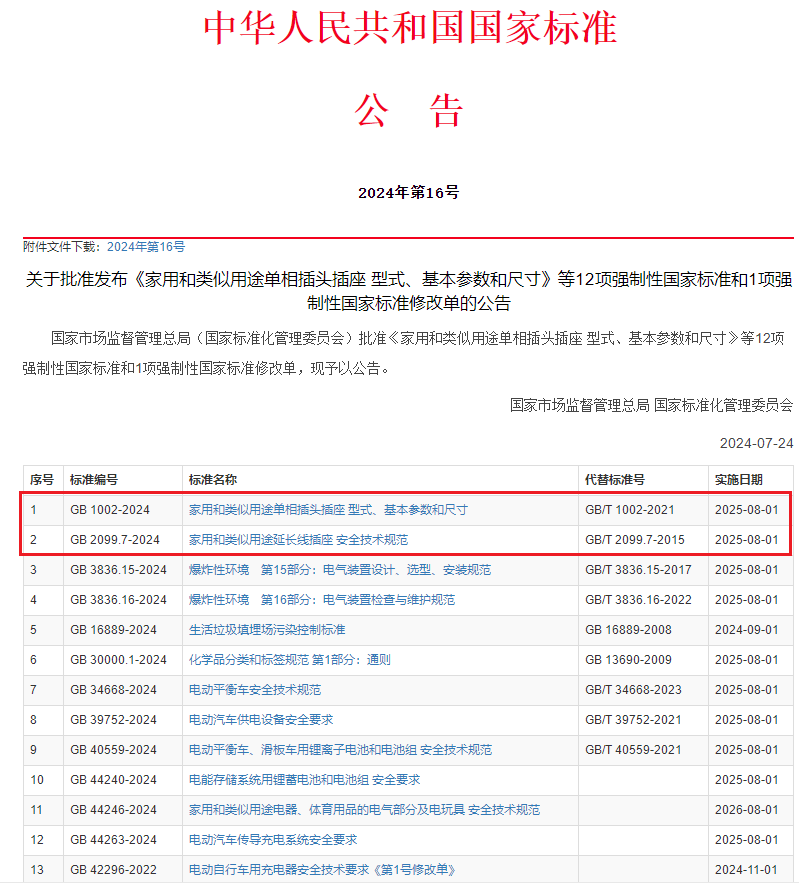 近日,國(guó)家標(biāo)準(zhǔn)GB 1002-2024《家用和類(lèi)似用途單相插頭插座 型式、基本參數(shù)和尺寸》、GB 2099.7-2024《家用和類(lèi)似用途延長(zhǎng)線插座 安全技術(shù)規(guī)范》正式發(fā)布,推薦性國(guó)家標(biāo)準(zhǔn)轉(zhuǎn)為強(qiáng)制性國(guó)家標(biāo)準(zhǔn),插頭插座安全強(qiáng)制升級(jí),將于2025年8月1日實(shí)施!